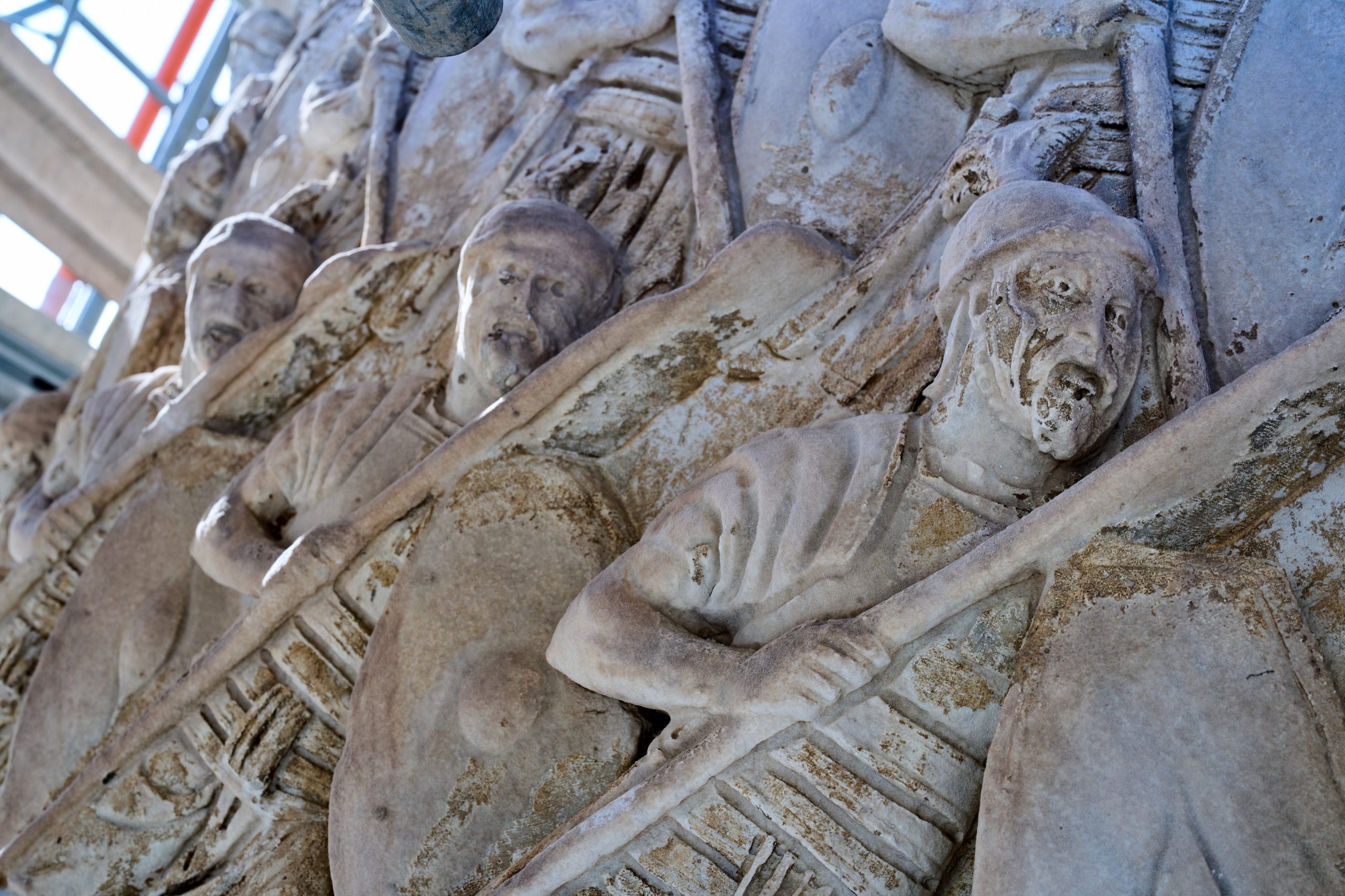 Bas-reliefs depicting scenes from a battle are seen on the second-century A.D. Column of Marcus Aurelius in central Rome during a media tour, Thursday, Dec. 18, 2025. (AP Photo/Domenico Stinellis)