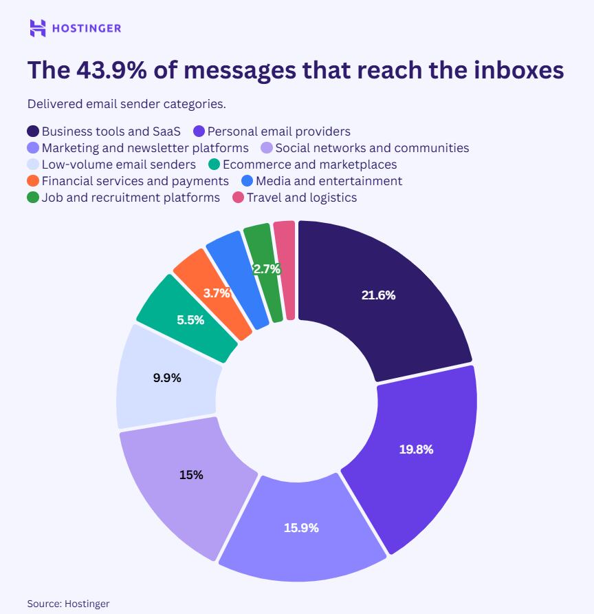 Sin embargo, de todas las categorías anteriores, solo los proveedores de correo personal y los emisores de bajo volumen implican la intervención humana. Ambas suman un 30 por ciento de los correos recibidos, lo que equivaldría al 13 por ciento del tráfico total, siendo el 87 por ciento restante correos automatizados, según Hostinger.
