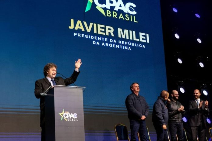 El presidente argentino, Javier Milei, habla durante la CPAC junto al expresidente brasileño Jair Bolsonaro, en 2024. (Foto: REUTERS)