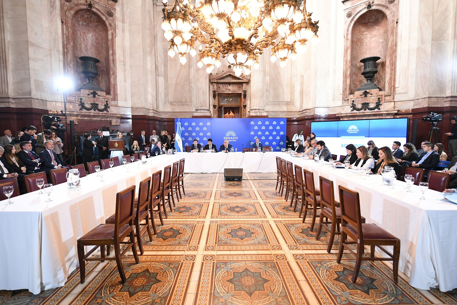 Una convención se lleva a cabo en un opulento salón del Senado argentino, con participantes sentados a largas mesas blancas y un panel de oradores al frente bajo un gran candelabro. (Mario Mosca/Comunicación Senado)