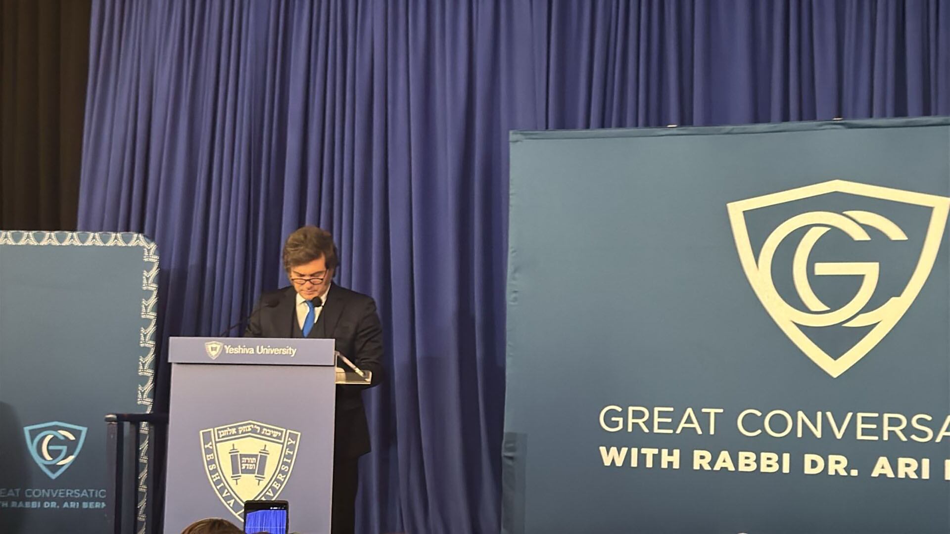 Milei fue presentado con esmero por el rabino Ari Berman, rector de la Universidad. El rabino citó a Golda Meir como figura global del judaísmo, y a continuación anunció la presencia del presidente argentino.