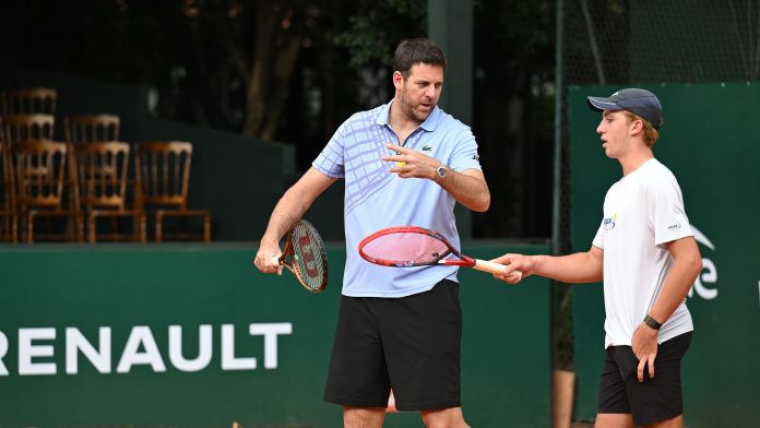 Juan Martín del Potro, cerca de las nuevas generaciones: el tandilense acompaña y aconseja a un junior en plena competencia (Crédito: FFT)