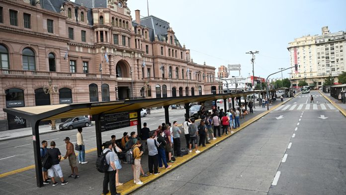 Pasajeros esperan en una parada de colectivos de Constitución durante el último paro general convocado por la CGT (Foto Maximiliano Luna)