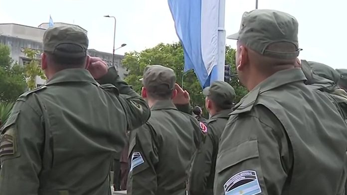 El oficial Nahuel Gallo rinde honores durante el izamiento de la bandera en el edificio de Gendarmería, un momento de solemnidad y respeto. (Captura de video)
