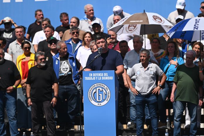 Cristian Jerónimo, cotitular de la CGT, habla en el acto de la Plaza de Mayo (RS Fotos)