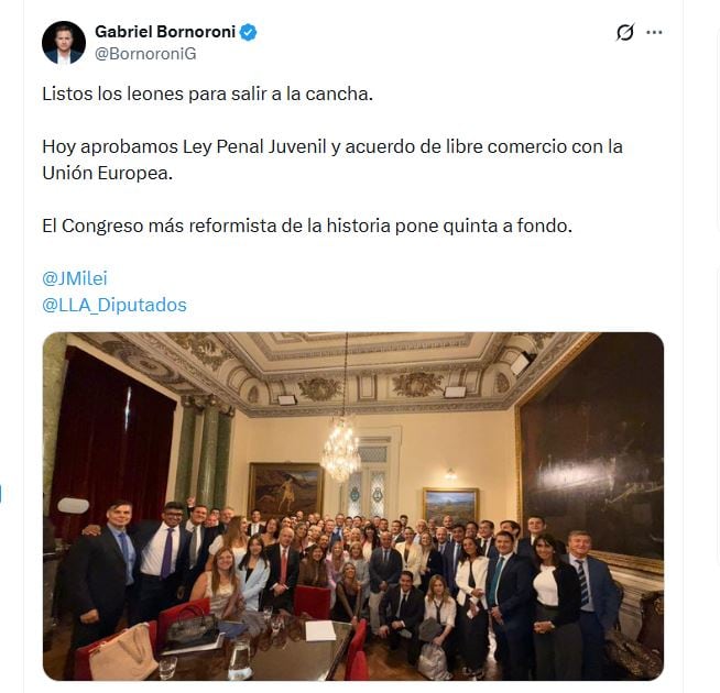 En el mismo posteo, Bornoroni aseguró que este jueves el Congreso avanzará con la aprobación de la Ley Penal Juvenil y con la ratificación del acuerdo de libre comercio entre el Mercosur y la Unión Europea. “El Congreso más reformista de la historia pone quinta a fondo”, afirmó, en línea con la estrategia del oficialismo de mostrar cohesión y expectativa de triunfo legislativo.