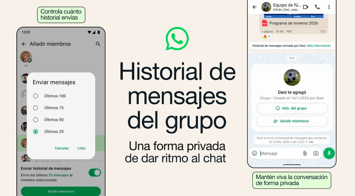 Al incorporar a una nueva persona, el grupo ofrece la posibilidad de compartir de manera selectiva entre 25 y 100 mensajes recientes, permitiendo que los nuevos integrantes accedan solo a la información más relevante sin necesidad de revisar conversaciones extensas. El envío del historial debe realizarlo de forma manual algún miembro del grupo, y los administradores cuentan con la opción de desactivar esta función si así lo prefieren, manteniendo siempre el control sobre cuándo y cómo se comparte.